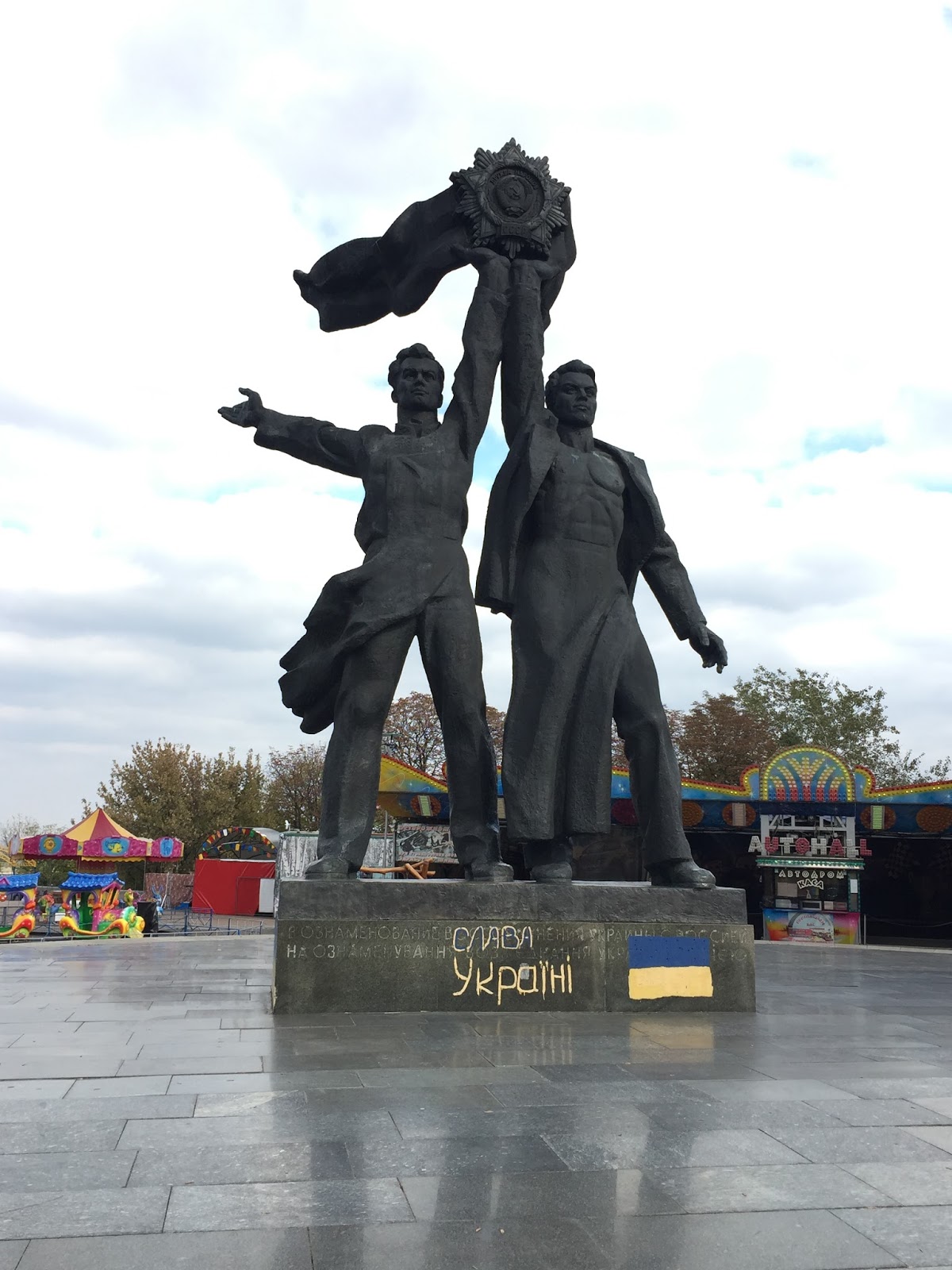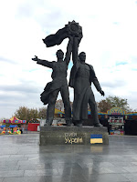 Pela manhã e já com o pequeno almoço tomado, arrancámos a caminhada rumo à Praça da Independência. Seguimos apenas 3, pois a noite da véspera havia feito 3 baixas: 2 continuavam a dormir, enquanto a terceira revelava um baixo teor de açúcar no sangue. Ao fim de meia hora a caminhar, chegámos à monumental praça, que tínhamos na memória devido aos confrontos de 2014. Agora, toda arranjada, é belíssima e imponente! Daí seguímos para o Estádio Dynamo Kyev, agora chamado Valeriy Lobanovskyi. Não foi possível entrar mas aproveitámos para tirar fotos à estátua do Lobo, bem como ao portal de entrada, no qual também ocorreram incidentes gravíssimos, com alguns mortos nos acontecimentos de 2014. A vantagem de Kyev é que é fácil fazer um itinerário e sectorizar as áreas a visitar. Assim sendo, logo ali ao lado dirigimo-nos ao grande arco da amizade. Este arco, num largo com vista para o rio Dnepr, simboliza a amizade entre Russos e Ucranianos. Por baixo do mesmo encontram-se duas estátuas gigantes: uma com dois soldados (um Russo e um Ucraniano e a simbolizar a amizade entre países), e outra a simbolizar um convénio da idade média. Vim a saber à posteriori que o está decidido que o arco será em breve removido pois com é sabido a amizade já não é o que era.
